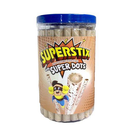 Superstix choco flavoured wafer sticks with super dots.Size: 346gIngredients: Sugar, wheat flour, vegetable fat and oil (palm and coconut), cassava...