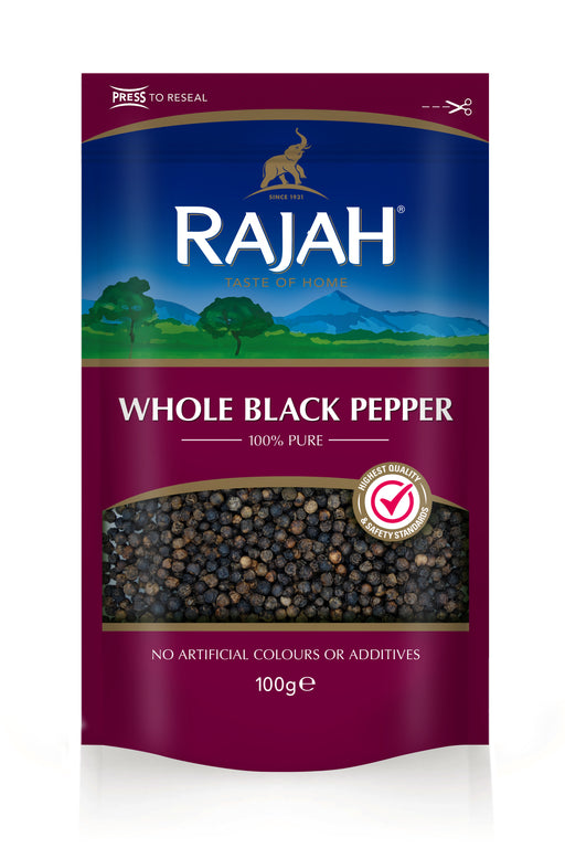 Rajah 全黑胡椒是黑胡椒藤未成熟的浆果,在阳光下晒干,具有穿透性的香气和特有的温暖、辛辣的味道和持久的热量,作为调料和调味品被普遍享用。 规格: 100克 原料:整个黑胡椒 在英国包装